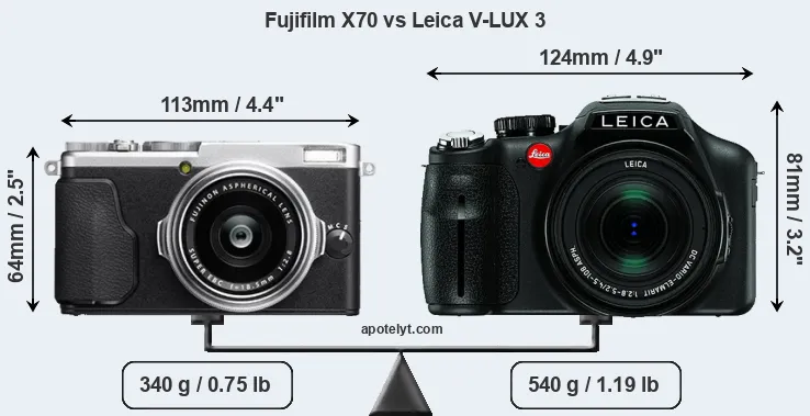 The physical size and weight of the Fujifilm X70 and the Leica V-LUX 3 are illustrated in the side-by-side display below. The two cameras are presented according to their relative size. Three consecutive perspectives from the front, the top, and the back are available. All width, height and depth measures are rounded to the nearest millimeter.