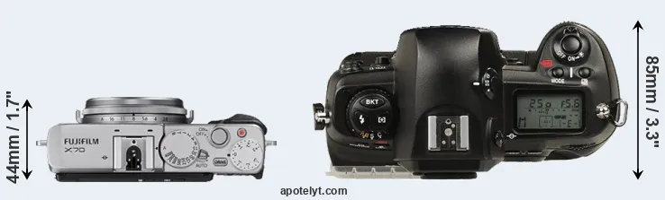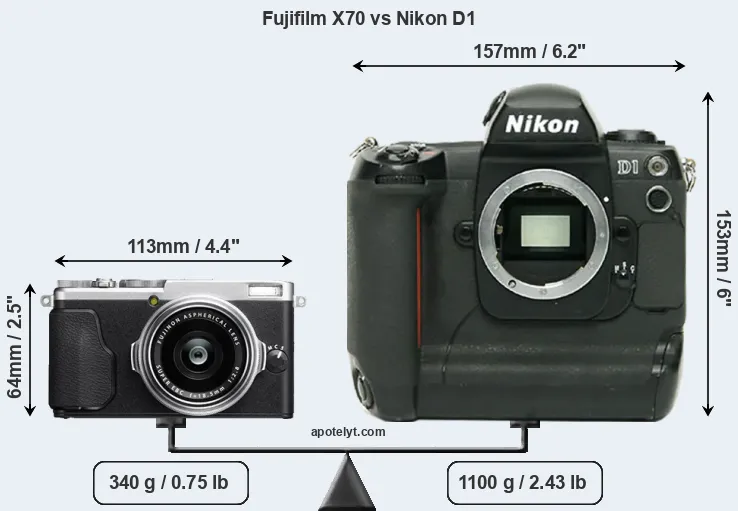 The side-by-side display below illustrates the physical size and weight of the Fujifilm X70 and the Nikon D1. The two cameras are presented according to their relative size. Three consecutive perspectives from the front, the top, and the back are available. All width, height and depth measures are rounded to the nearest millimeter.