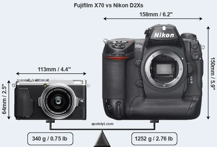 The physical size and weight of the Fujifilm X70 and the Nikon D2Xs are illustrated in the side-by-side display below. The two cameras are presented according to their relative size. Three successive views from the front, the top, and the rear are shown. All width, height and depth dimensions are rounded to the nearest millimeter.