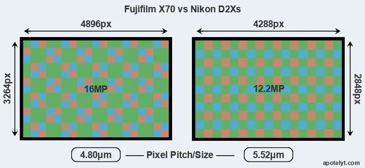 Despite having a slightly smaller sensor, the Fujifilm X70 offers a higher resolution of 16 megapixels, compared with 12.2 MP of the Nikon D2Xs. This megapixels advantage comes at the cost of a higher pixel density and a smaller size of the individual pixel (with a pixel pitch of 4.80μm versus 5.52μm for the D2Xs). However, it should be noted that the X70 is much more recent (by 9 years and 7 months) than the D2Xs, and its sensor will have benefitted from technological advances during this time that make it possible to gather light more efficiently. Coming back to sensor resolution, it should be mentioned that the X70 has no anti-alias filter installed, so that it can capture all the detail its sensor resolves.