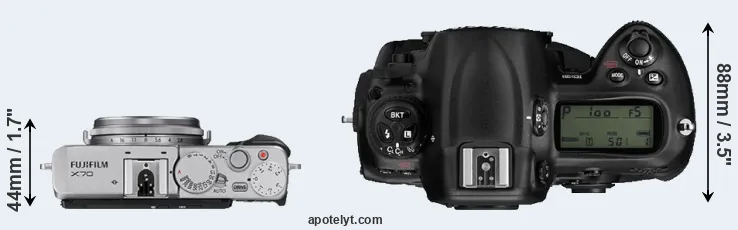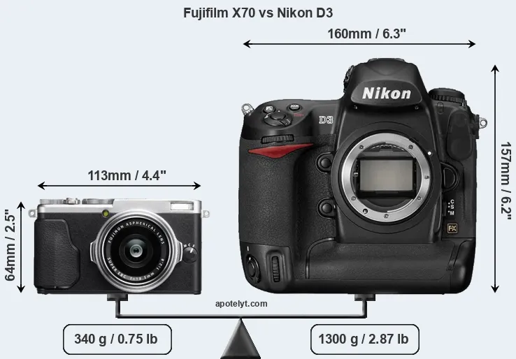 The physical size and weight of the Fujifilm X70 and the Nikon D3 are illustrated in the side-by-side display below. The two cameras are presented according to their relative size. Three consecutive views from the front, the top, and the rear side are shown. All width, height and depth measures are rounded to the nearest millimeter.