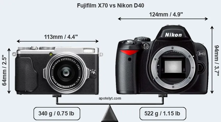 An illustration of the physical size and weight of the Fujifilm X70 and the Nikon D40 is provided in the side-by-side display below. The two cameras are presented according to their relative size. Three successive views from the front, the top, and the rear are shown. All width, height and depth dimensions are rounded to the nearest millimeter.