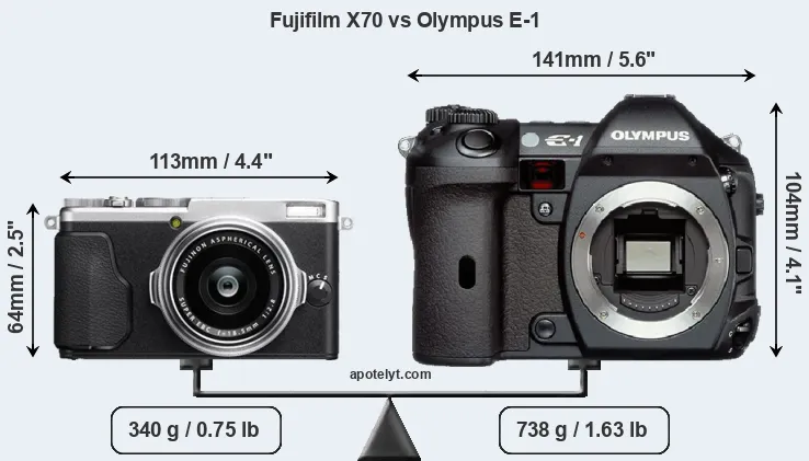 If the front view area (width x height) of the cameras is taken as an aggregate measure of their size, the Olympus E-1 is considerably larger (103 percent) than the Fujifilm X70. It is noteworthy in this context that the E-1 is splash and dust-proof, while the X70 does not feature any corresponding weather-sealing.