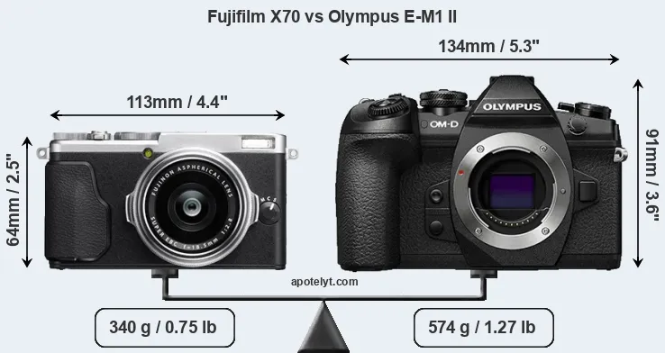 If the front view area (width x height) of the cameras is taken as an aggregate measure of their size, the Olympus E-M1 II is considerably larger (69 percent) than the Fujifilm X70. It is noteworthy in this context that the E-M1 II is splash and dust-proof, while the X70 does not feature any corresponding weather-sealing.