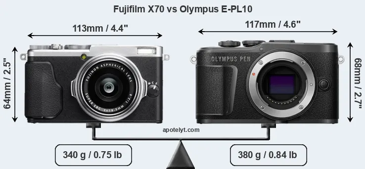 The side-by-side display below illustrates the physical size and weight of the Fujifilm X70 and the Olympus E-PL10. The two cameras are presented according to their relative size. Three consecutive perspectives from the front, the top, and the back are available. All size dimensions are rounded to the nearest millimeter.