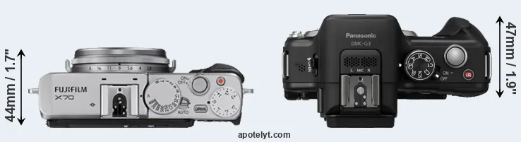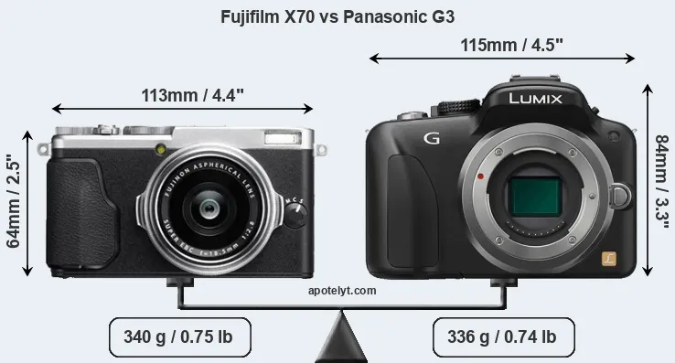 An illustration of the physical size and weight of the Fujifilm X70 and the Panasonic G3 is provided in the side-by-side display below. The two cameras are presented according to their relative size. Three consecutive perspectives from the front, the top, and the back are available. All size dimensions are rounded to the nearest millimeter.