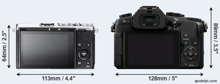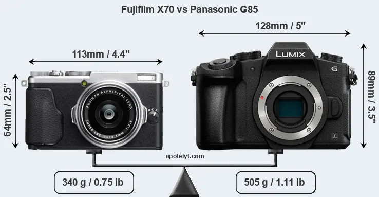 If the front view area (width x height) of the cameras is taken as an aggregate measure of their size, the Panasonic G85 is considerably larger (58 percent) than the Fujifilm X70. It is noteworthy in this context that the G85 is splash and dust-proof, while the X70 does not feature any corresponding weather-sealing.