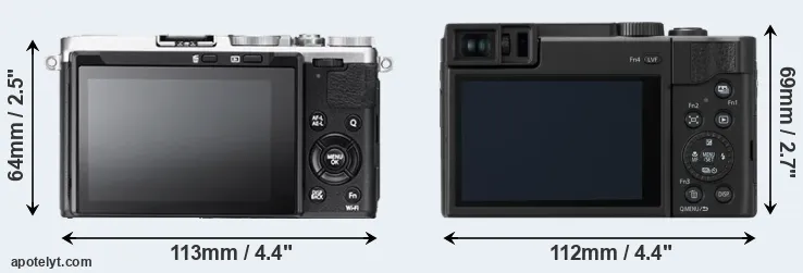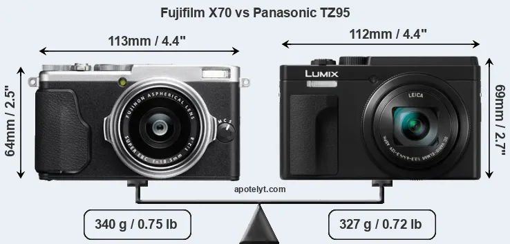 The physical size and weight of the Fujifilm X70 and the Panasonic TZ95 are illustrated in the side-by-side display below. The two cameras are presented according to their relative size. Three successive views from the front, the top, and the rear are shown. All width, height and depth measures are rounded to the nearest millimeter.