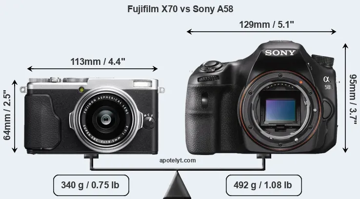 If the front view area (width x height) of the cameras is taken as an aggregate measure of their size, the Sony A58 is considerably larger (69 percent) than the Fujifilm X70. In this context, it is worth noting that neither the X70 nor the A58 are weather-sealed.