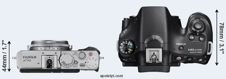 Going beyond this snapshot of core features and characteristics, what are the differences between the Fujifilm X70 and the Sony Alpha SLT-A58? Which one should you buy? Read on to find out how these two cameras compare with respect to their body size, their imaging sensors, their shooting features, their input-output connections, and their reception by expert reviewers.