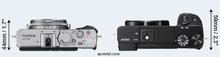If the front view area (width x height) of the cameras is taken as an aggregate measure of their size, the Sony A6100 is notably larger (11 percent) than the Fujifilm X70. In this context, it is worth noting that neither the X70 nor the A6100 are weather-sealed.
