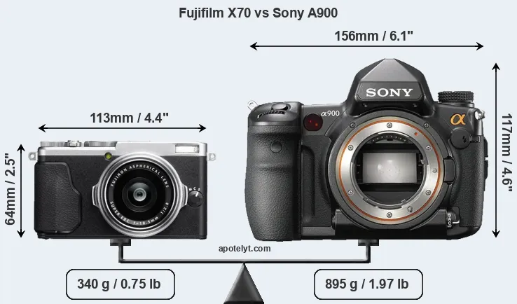 The physical size and weight of the Fujifilm X70 and the Sony A900 are illustrated in the side-by-side display below. The two cameras are presented according to their relative size. Three successive views from the front, the top, and the rear are shown. All width, height and depth measures are rounded to the nearest millimeter.