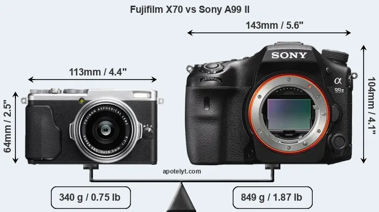 If the front view area (width x height) of the cameras is taken as an aggregate measure of their size, the Sony A99 II is considerably larger (106 percent) than the Fujifilm X70. It is noteworthy in this context that the A99 II is splash and dust-proof, while the X70 does not feature any corresponding weather-sealing.