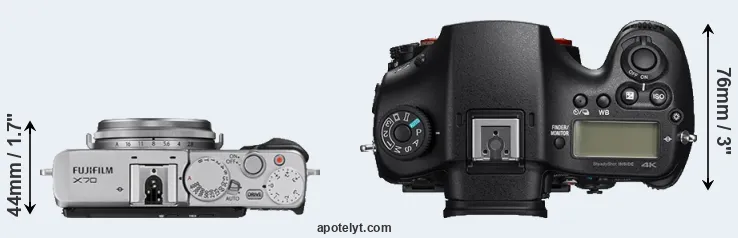 The side-by-side display below illustrates the physical size and weight of the Fujifilm X70 and the Sony A99 II. The two cameras are presented according to their relative size. Three successive views from the front, the top, and the rear are shown. All size dimensions are rounded to the nearest millimeter.