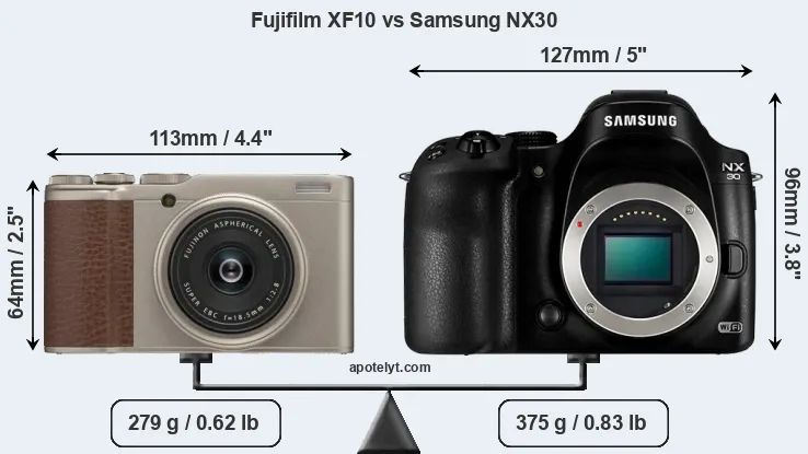 The side-by-side display below illustrates the physical size and weight of the Fujifilm XF10 and the Samsung NX30. The two cameras are presented according to their relative size. Three consecutive perspectives from the front, the top, and the back are available. All width, height and depth measures are rounded to the nearest millimeter.