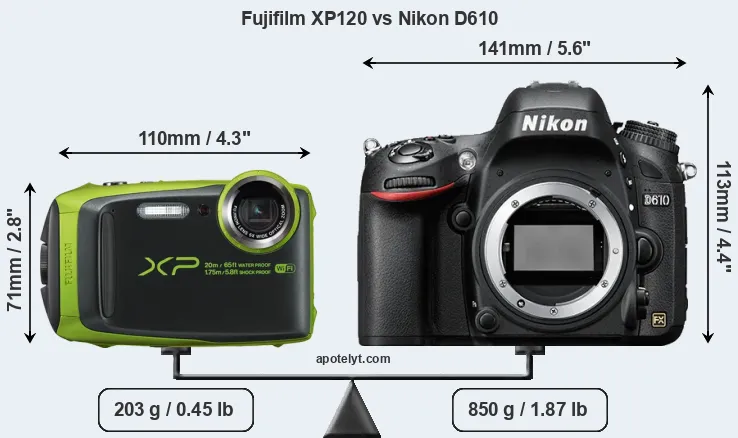 The physical size and weight of the Fujifilm XP120 and the Nikon D610 are illustrated in the side-by-side display below. The two cameras are presented according to their relative size. Three consecutive views from the front, the top, and the rear side are shown. All size dimensions are rounded to the nearest millimeter.