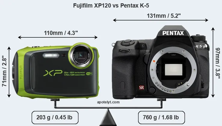 The side-by-side display below illustrates the physical size and weight of the Fujifilm XP120 and the Pentax K-5. The two cameras are presented according to their relative size. Three consecutive views from the front, the top, and the rear side are shown. All size dimensions are rounded to the nearest millimeter.