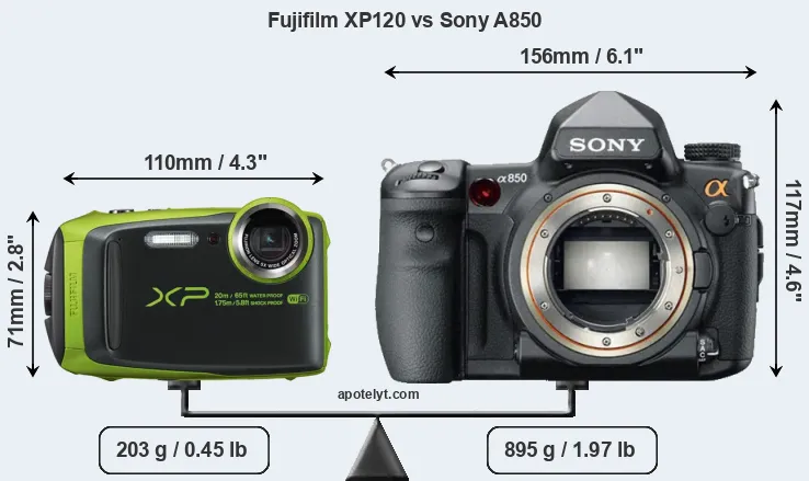The side-by-side display below illustrates the physical size and weight of the Fujifilm XP120 and the Sony A850. The two cameras are presented according to their relative size. Three successive views from the front, the top, and the rear are shown. All size dimensions are rounded to the nearest millimeter.