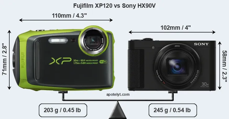 An illustration of the physical size and weight of the Fujifilm XP120 and the Sony HX90V is provided in the side-by-side display below. The two cameras are presented according to their relative size. Three consecutive views from the front, the top, and the rear side are shown. All width, height and depth measures are rounded to the nearest millimeter.