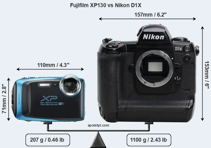 If the front view area (width x height) of the cameras is taken as an aggregate measure of their size, the Nikon D1X is considerably larger (208 percent) than the Fujifilm XP130. In this context, it is worth noting that both cameras are splash and dust-proof and can, hence, be used in inclement weather conditions or harsh environments. More than that, the XP130 is water-proof up to 20m and can, thus, be used for underwater photography.