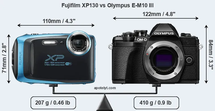 The physical size and weight of the Fujifilm XP130 and the Olympus E-M10 III are illustrated in the side-by-side display below. The two cameras are presented according to their relative size. Three consecutive perspectives from the front, the top, and the back are available. All width, height and depth dimensions are rounded to the nearest millimeter.