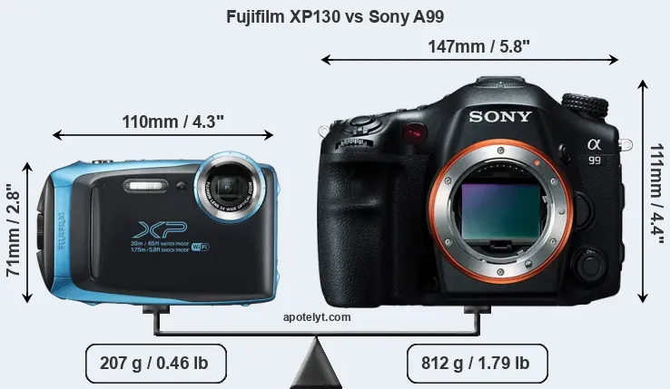 An illustration of the physical size and weight of the Fujifilm XP130 and the Sony A99 is provided in the side-by-side display below. The two cameras are presented according to their relative size. Three consecutive views from the front, the top, and the rear side are shown. All width, height and depth measures are rounded to the nearest millimeter.