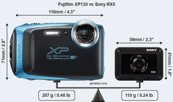 An illustration of the physical size and weight of the Fujifilm XP130 and the Sony RX0 is provided in the side-by-side display below. The two cameras are presented according to their relative size. Three consecutive views from the front, the top, and the rear side are shown. All width, height and depth measures are rounded to the nearest millimeter.