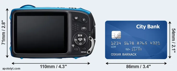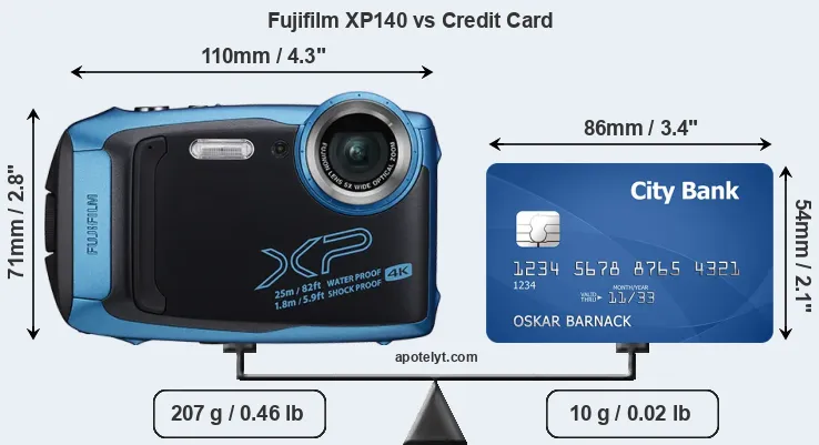 The physical dimensions of the Fujifilm XP140 relative to a credit card are illustrated in the side-by-side display below. Three consecutive views from the front, the top, and the rear side are shown. All width, height and depth measures are rounded to the nearest millimeter.