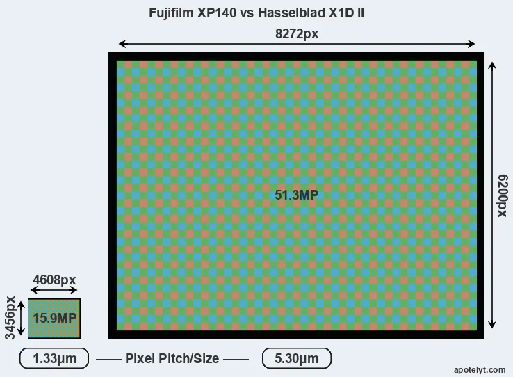 | Sensor Specs | Fujifilm XP140 | Hasselblad X1D II |