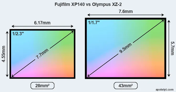 Of the two cameras under consideration, the Fujifilm XP140 features a 1/2.3-inch sensor and the Olympus XZ-2 a 1/1.7-inch sensor. The sensor area in the XZ-2 is 54 percent bigger. As a result of these sensor size differences, the cameras have a format factor of, respectively, 5.6 and 4.4. Both cameras feature a native aspect ratio (sensor width to sensor height) of 4:3.