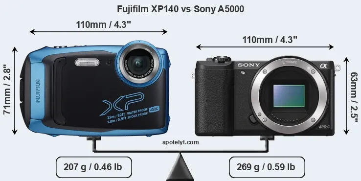 An illustration of the physical size and weight of the Fujifilm XP140 and the Sony A5000 is provided in the side-by-side display below. The two cameras are presented according to their relative size. Three consecutive perspectives from the front, the top, and the back are available. All width, height and depth dimensions are rounded to the nearest millimeter.