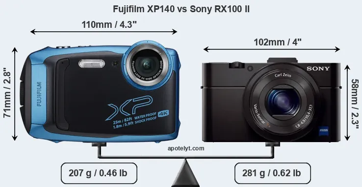 The physical size and weight of the Fujifilm XP140 and the Sony RX100 II are illustrated in the side-by-side display below. The two cameras are presented according to their relative size. Three consecutive views from the front, the top, and the rear side are shown. All width, height and depth dimensions are rounded to the nearest millimeter.