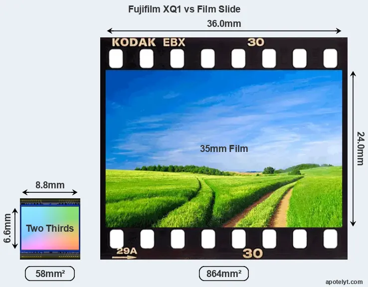 The Fujifilm XQ1 features a 2/3 sensor and has a format factor (sometimes also referred to as "crop factor") of 3.9. Within the spectrum of camera sensors, this places the Fujifilm XQ1 among the smaller-sensor digicams that favor affordability and compact design.