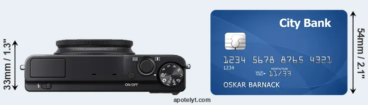 An illustration of the physical dimensions of the Fujifilm XQ1 vis-à-vis a credit card is provided in the side-by-side display below. Three successive views from the front, the top, and the rear are shown. All width, height and depth measures are rounded to the nearest millimeter.
