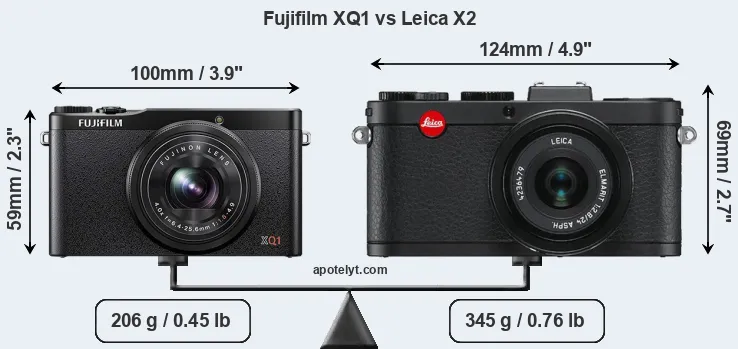The physical size and weight of the Fujifilm XQ1 and the Leica X2 are illustrated in the side-by-side display below. The two cameras are presented according to their relative size. Three consecutive perspectives from the front, the top, and the back are available. All width, height and depth measures are rounded to the nearest millimeter.