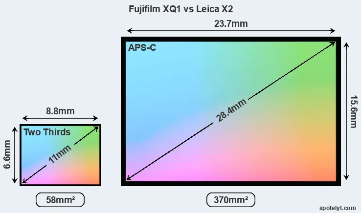 Of the two cameras under consideration, the Fujifilm XQ1 features a 2/3 sensor and the Leica X2 an APS-C sensor. The sensor area in the X2 is 538 percent bigger. As a result of these sensor size differences, the cameras have a format factor of, respectively, 3.9 and 1.5. The sensor in the XQ1 has a native 4:3 aspect ratio, while the one in the X2 offers a 3:2 aspect.