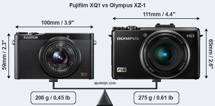 If the front view area (width x height) of the cameras is taken as an aggregate measure of their size, the Olympus XZ-1 is notably larger (22 percent) than the Fujifilm XQ1. Moreover, the XZ-1 is markedly heavier (33 percent) than the XQ1. In this context, it is worth noting that neither the XQ1 nor the XZ-1 are weather-sealed.