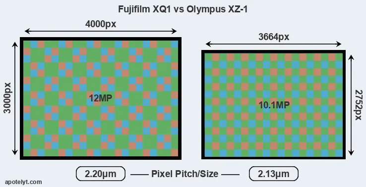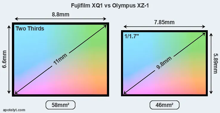 Of the two cameras under consideration, the Fujifilm XQ1 features a 2/3 sensor and the Olympus XZ-1 a 1/1.7-inch sensor. The sensor area in the XZ-1 is 21 percent smaller. As a result of these sensor size differences, the cameras have a format factor of, respectively, 3.9 and 4.4. Both cameras feature a native aspect ratio (sensor width to sensor height) of 4:3.