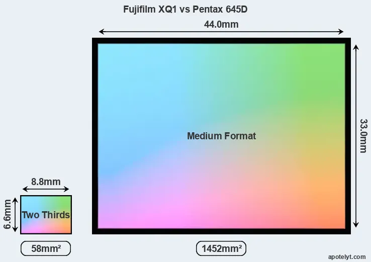 Of the two cameras under consideration, the Fujifilm XQ1 features a 2/3 sensor and the Pentax 645D a medium format sensor. The sensor area in the 645D is 2403 percent bigger. As a result of these sensor size differences, the cameras have a format factor of, respectively, 3.9 and 0.79. Both cameras feature a native aspect ratio (sensor width to sensor height) of 4:3.