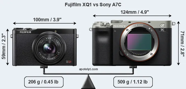 The side-by-side display below illustrates the physical size and weight of the Fujifilm XQ1 and the Sony A7C. The two cameras are presented according to their relative size. Three consecutive perspectives from the front, the top, and the back are available. All width, height and depth dimensions are rounded to the nearest millimeter.