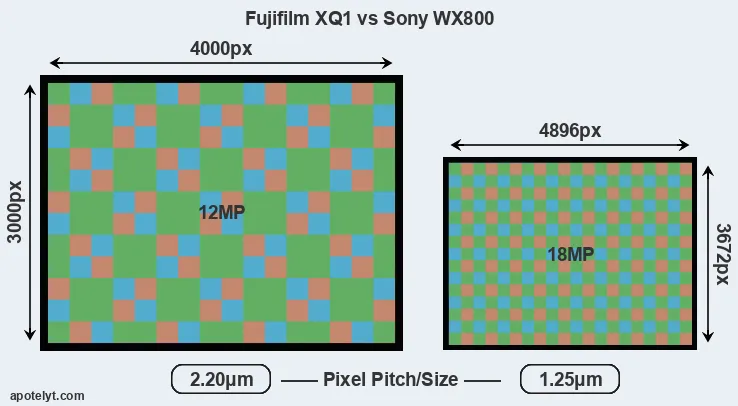 Despite having a smaller sensor, the WX800 offers a higher resolution of 18 megapixels, compared with 12 MP of the XQ1. This megapixels advantage comes at the cost of a higher pixel density and a smaller size of the individual pixel (with a pixel pitch of 1.25μm versus 2.20μm for the XQ1). However, it should be noted that the WX800 is much more recent (by 4 years and 11 months) than the XQ1, and its sensor will have benefitted from technological advances during this time that make it possible to gather light more efficiently. Coming back to sensor resolution, it should be mentioned that neither of the two cameras has an anti-alias filter installed, so they are able to capture all the detail the sensor resolves.