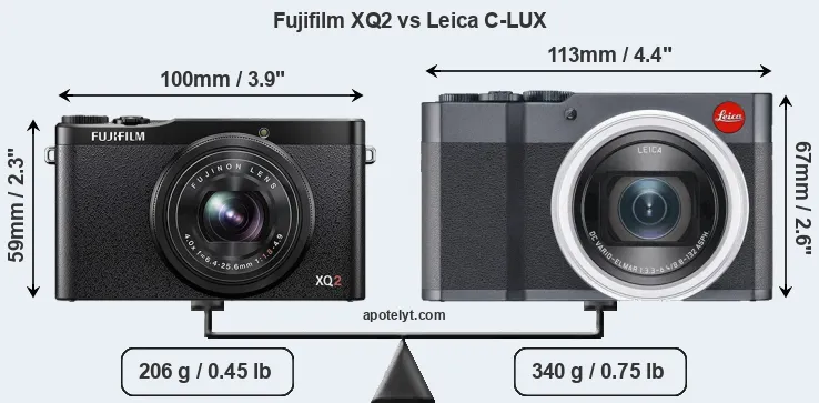 If the front view area (width x height) of the cameras is taken as an aggregate measure of their size, the Leica C-LUX is notably larger (28 percent) than the Fujifilm XQ2. Moreover, the C-LUX is substantially heavier (65 percent) than the XQ2. In this context, it is worth noting that neither the XQ2 nor the C-LUX are weather-sealed.
