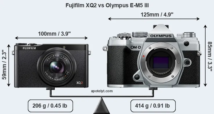 The physical size and weight of the Fujifilm XQ2 and the Olympus E-M5 III are illustrated in the side-by-side display below. The two cameras are presented according to their relative size. Three successive views from the front, the top, and the rear are shown. All width, height and depth measures are rounded to the nearest millimeter.