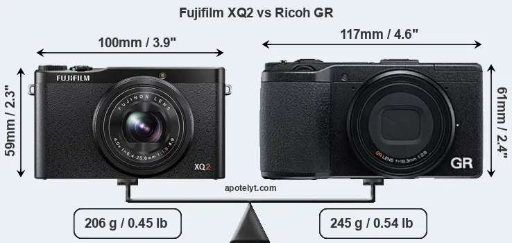 If the front view area (width x height) of the cameras is taken as an aggregate measure of their size, the Ricoh GR is notably larger (21 percent) than the Fujifilm XQ2. Moreover, the GR is markedly heavier (19 percent) than the XQ2. In this context, it is worth noting that neither the XQ2 nor the GR are weather-sealed.