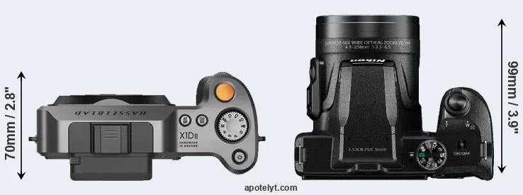 The physical size and weight of the Hasselblad X1D II and the Nikon B600 are illustrated in the side-by-side display below. The two cameras are presented according to their relative size. Three consecutive perspectives from the front, the top, and the back are available. All width, height and depth dimensions are rounded to the nearest millimeter.