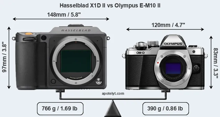 If the front view area (width x height) of the cameras is taken as an aggregate measure of their size, the Olympus E-M10 II is considerably smaller (31 percent) than the Hasselblad X1D II. Moreover, the E-M10 II is substantially lighter (49 percent) than the X1D II. It is worth mentioning in this context that the X1D II is splash and dust resistant, while the E-M10 II does not feature any corresponding weather-sealing.