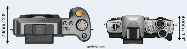 The physical size and weight of the Hasselblad X1D II and the Olympus E-M10 II are illustrated in the side-by-side display below. The two cameras are presented according to their relative size. Three consecutive views from the front, the top, and the rear side are shown. All width, height and depth dimensions are rounded to the nearest millimeter.