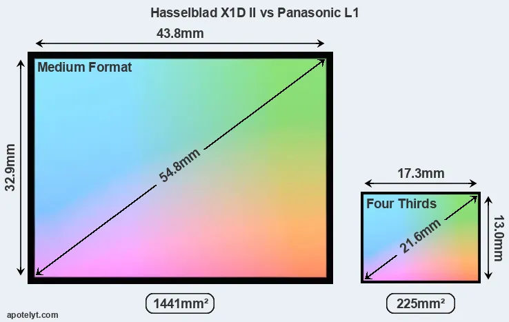 Of the two cameras under consideration, the Hasselblad X1D II features a medium format sensor and the Panasonic L1 a Four Thirds sensor. The sensor area in the L1 is 84 percent smaller. As a result of these sensor size differences, the cameras have a format factor of, respectively, 0.79 and 2.0. Both cameras feature a native aspect ratio (sensor width to sensor height) of 4:3.