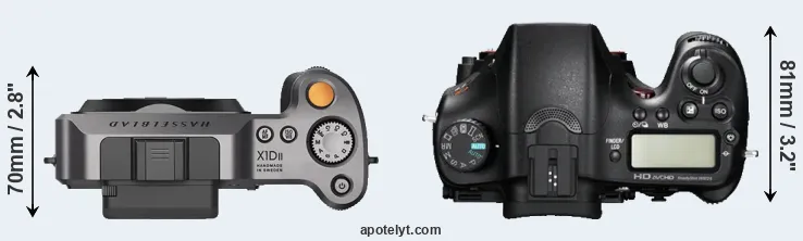 The physical size and weight of the Hasselblad X1D II and the Sony A77 are illustrated in the side-by-side display below. The two cameras are presented according to their relative size. Three consecutive perspectives from the front, the top, and the back are available. All width, height and depth measures are rounded to the nearest millimeter.