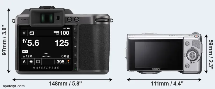The physical size and weight of the Hasselblad X1D II and the Sony NEX-5 are illustrated in the side-by-side display below. The two cameras are presented according to their relative size. Three consecutive perspectives from the front, the top, and the back are available. All width, height and depth dimensions are rounded to the nearest millimeter.